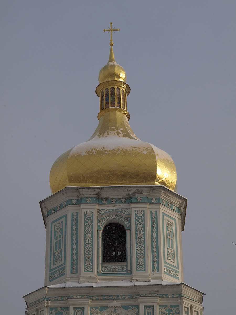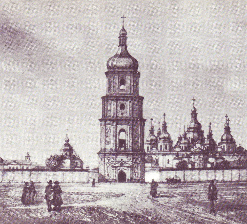 BELL TOWERThe high bell tower dominates the entire grounds of the St. Sophia Museum. Its site on the east side of the cathedral was dictated by the historical topography of Kiev: from an architectural point of view it was necessary that it face St. Sophia Square (now Bogdan Khmelnitsky Square). The Bell Tower was the first brick building to arise on the grounds of the St. Sophia Monastery after the 1697 fire. It was built from 1699 to 1706. In 1709, the victorious army of the Battle of Poltava, led by Peter I, was given a triumphant reception near the bell tower. The original bell tower had three tiers. The architect is unknown: one document preserves only the name of Savva Yakovlev, 'under-master of stone masonry', who took part in the construction. Soon after it was completed, the upper tiers began to collapse due to an earthquake. From 1744 to 1748, the building was restored under the guidance of J. Schadel, a famous Petersburg architect. The two upper storeys were dismantled and replaced by new structures. Gifted Ukrainian artisans from Zholkva, Ivan and Stepan Stobensky, worked on the plaster embellishments of its walls. The new tower also had three tiers. It was crowned by a baroque dome topped by a tall gilded spire. St. Sophia Monastery. Drawing by M. Sazhin. 1840s: St. Sophia Square in Kiev. Lithograph by an anonymous artist. Mid-19th century: By the turn of the 19th century, the bell tower was showing signs of serious deterioration and in 1807 its cupola was struck by lightning and burnt down. It was restored in 1812 but given a new architectural design. By the mid-19th century, due to the erection of high buildings in adjacent districts, the bell tower began to lose its position of prominence over the square. Thus, in 1851 -1852, the fourth tier was built to the design of architect P. Sparro. It was crowned with a wooden pear-shaped dome covered with copper gilt, and its basic form remains the same today. In the 1950s and 1970s, the bell tower underwent capital repairs and the dome was newly gilded. The Bell Tower. View from the west: The Bell Tower. View from the east: The bell tower is 76 metres high. It is built in the shape of a stepped pyramid of four tiers, gradually decreasing in size to the culmination point of the dome. The two lower tiers are rectangular in plan, the two upper octagonal. The wide vaulted entrance-passage is centred in the ground-floor tier. Directly above, there is an enclosed chamber which is reached by way of a spiral staircase built inside the thick masonry wall on the north side. The three upper tiers are without floors or ceilings and outside have large open embrasures set in the walls. The architectural design of the exterior is of special interest. The tiered composition is emphasized by complex cornices. Flat ornamental pilasters arranged vertically on the tiered facades enhance the building's graceful lines. The sculptural ornamentation with opulent and variegated motifs is particularly striking: there are masques, cupids' heads, doubleheaded eagles, medallions, acanthus leaves, grape clusters, bouquets and garlands of flowers. The first tier of the bell tower is remarkable for its particularly rich architectural and plaster embellishments, and testifies to the strong influence of the Ukrainian folk art. The sculptured portraits in rectangular frames on the walls of the third tier represent Prince Vladimir Svyatoslavich and the Apostle Andrew the First - Called (east facade), and the Apostle Timothy and the Archangel Raphael (west facade).