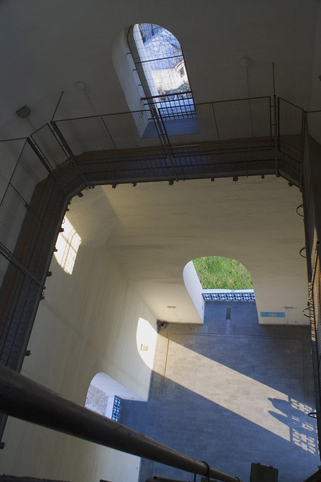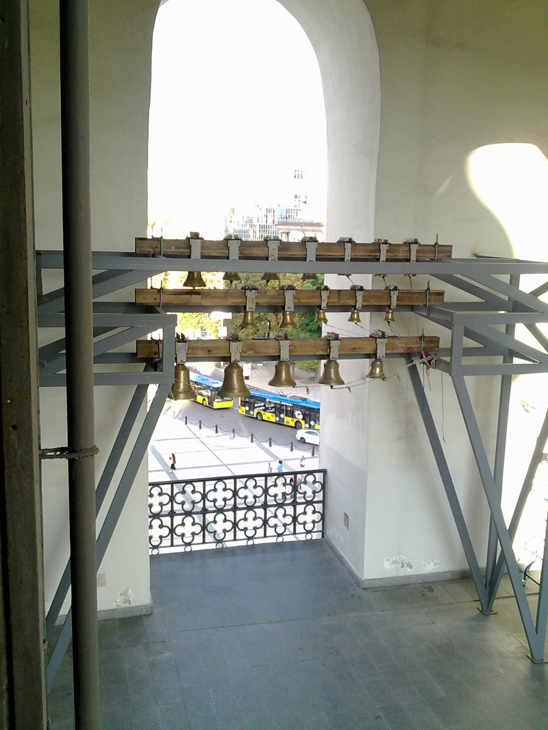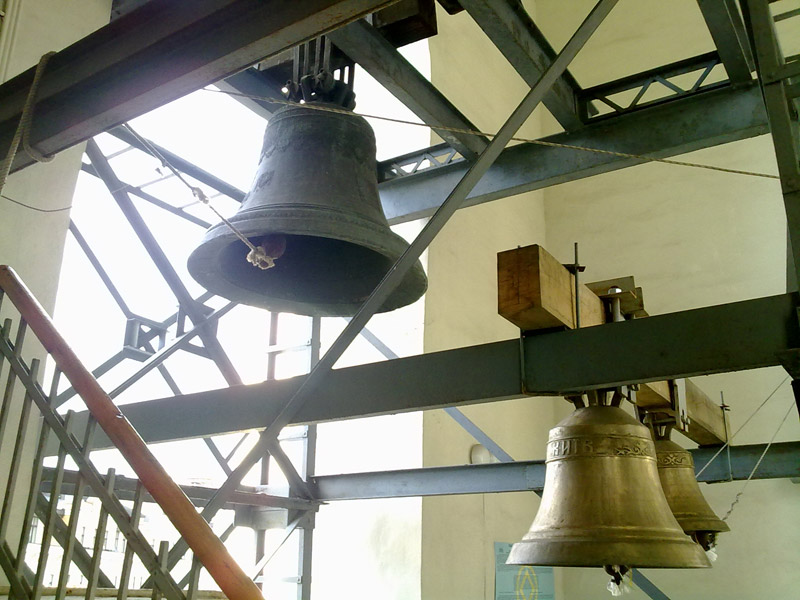 The plaster decor of the bell tower was executed by very dissimilar means. The bas-relief decorations were hand-moulded from lime mortar directly on the walls. Those in high-relief (masques, figures, etc.) were moulded separately from the same mortar with added alabaster, then attached to the walls by hammered nails. The ornaments of the fourth tier are standard repetitive details that were moulded of alabaster and attached to the walls by nails. The vertical panels of the facades with their decorative niches of various forms and the superb perfection of the architectural decor create a delicate play of light and shade that makes the bell tower exquisitely picturesque. The Bell Tower. Detail of the decor: The bell in the second tier (first floor) was cast in 1705 by Afanasiy Petrovich, a gifted Kiev artisan. The bell is decorated with luxuriant plant ornamentation, with a wide frieze around the neck and a narrow band encircling the lower rim. It weighs about 13 metric tons, and is a valuable relic of early 18th-century casting in the Ukraine. The original colour scheme of the bell tower was polychromatic: the vivid multicoloured stucco images and decorations on a cobalt blue background were reminiscent of folk decorative art. After the reconstruction carried out in the 18th century, the facade was given the bi-colour scheme which it bears to this day. The white alabaster ornamentation on a turquoise background and the golden dome always make the bell tower look fresh, festive and triumphant. The St. Sophia Bell Tower is a brilliant example of Ukrainian 18th-century architecture. Its graceful, airy contours give it an originality that makes it stand out from the surrounding buildings and adds distinction to the city image. Inside the Bell Tower: |