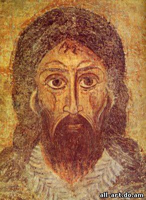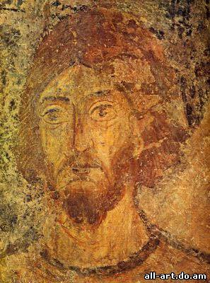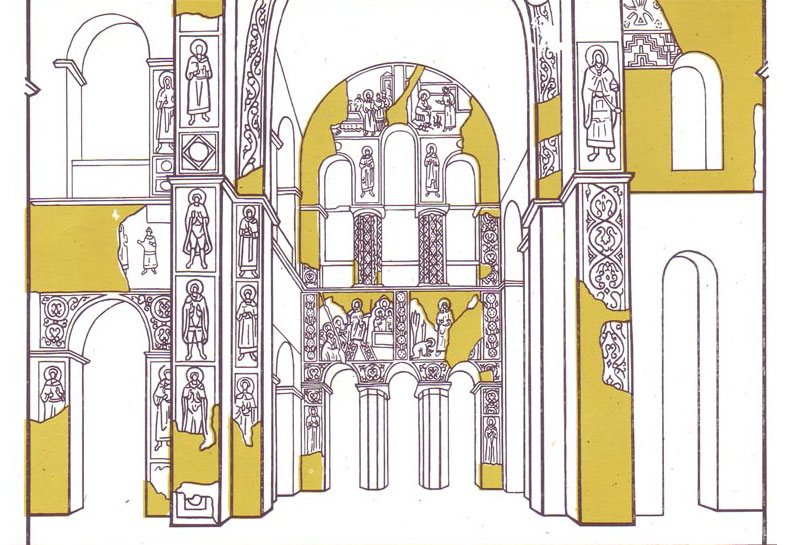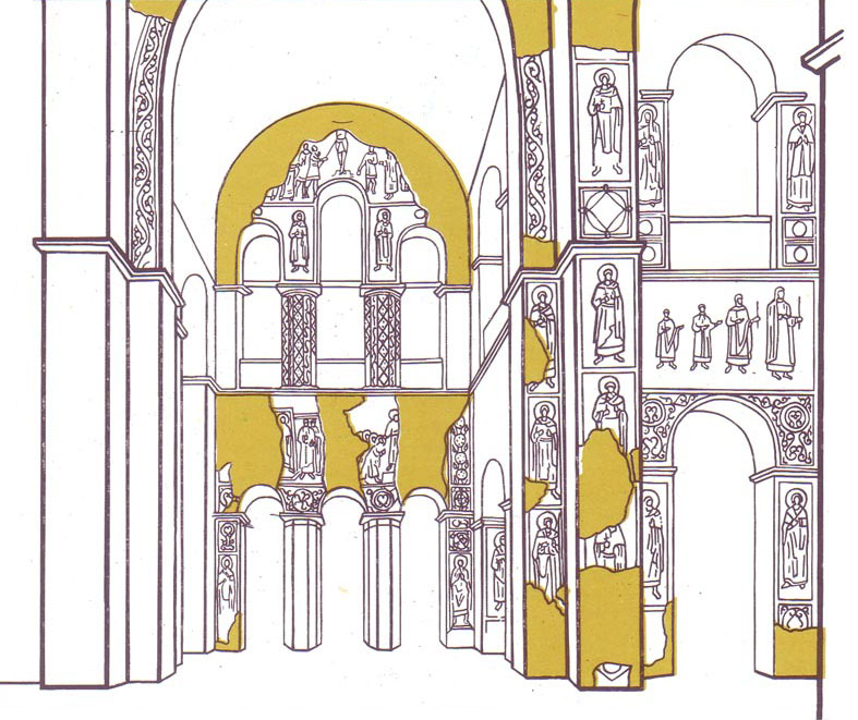FRESCOSFrescos, in early times, covered all the lateral walls of the building, as well as those in the lofts and towers. When repairs were made in the 17th century, the original paintings were partly renovated with size colours. At the turn of the 18th century, the ancient frescos, damaged at the time, were even plastered over and covered with whitewash. In the 18th century, new paintings which met contemporary demands were painted in oils on top of the originals. In the mid-19th century, the frescos under the 18th-century paintings were cleared of the overpainting and again covered with oil paintings which, however, were of no artistic value though the subjects were imitations of old iconography. Transept. North section. Diagram of frescos arrangement: Transept. South section. Diagram of frescos arrangement: During the years spent on modern restoration work in the St. Sophia Cathedral, the 11th-century frescos were cleared of the later overpaintings and the exfoliated parts were re-placed. Where the original frescos were lost beyond recall, the paintings of a later date were preserved in order to maintain the unity of the entire mural complex. In some places 17th- and 18th-century compositions were retained. fresco Christ's Descent into Hell. Transept. North section: Christ's Descent into Hell. Prophets. Detail Descent of the Holy Ghost. Detail. Transept. South section: The scheme of fresco paintings included large group-scenes, both full- and half-figure images of saints, as well as numerous ornamentations. In the space below the central cupola were placed large group compositions of scenes from the Gospel which depicted the deeds and the martyrdom of Christ, and stories of the spreading of the Christian faith. Originally, these compositions were arranged chronologically in three tiers running from left to right. The first scenes of the cycle were painted on the vaults of the transept and in the western part of the nave. However, none of the frescos of the upper tier have survived to our times. The scenes of the middle tier were painted over the vaults of the triple-arched arcades, and begin at the northern part of the transept with two compositions: Peter's Denial of Christ and Christ Before Caiaphas. Further, the story is picked up in the southern part of the transept with the painting of the Crucifixion. The frescos of the lower tier are placed above the octagonal columns of the transept. The north wall preserves the scenes The Descent of Christ into Hell and Christ Appears to the Women Bearing Spices; and the south wall The Doubting of Thomas and Sending the Disciples Forth to Preach. On the wall adjoining the latter picture is the concluding scene of the Gospel cycle The Descent of the Holy Ghost.