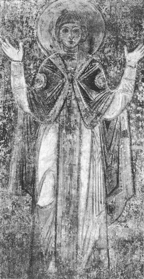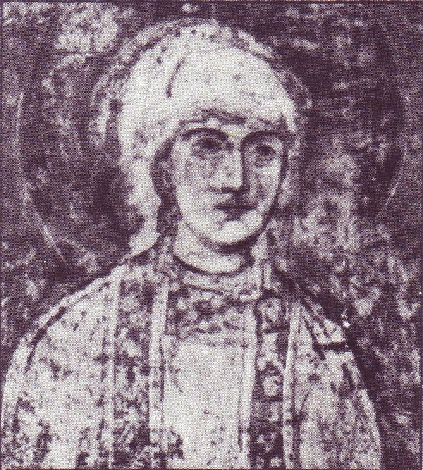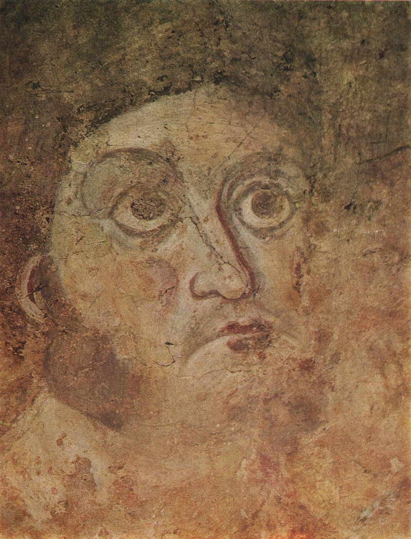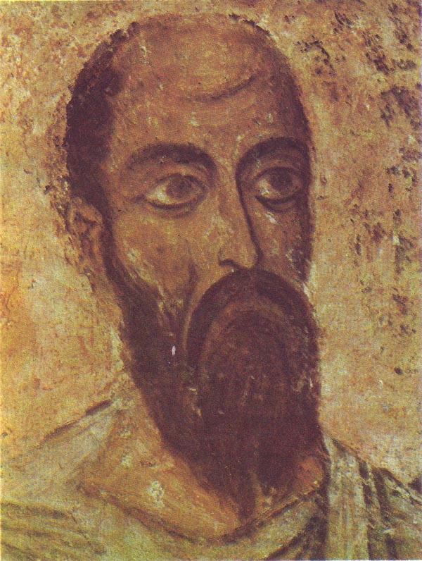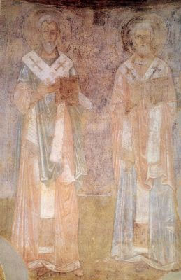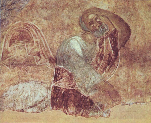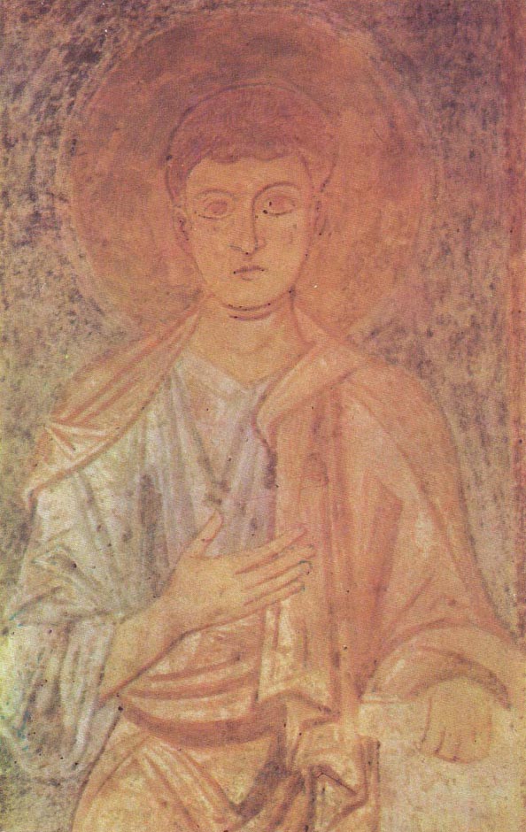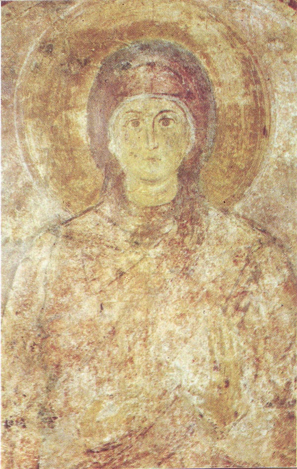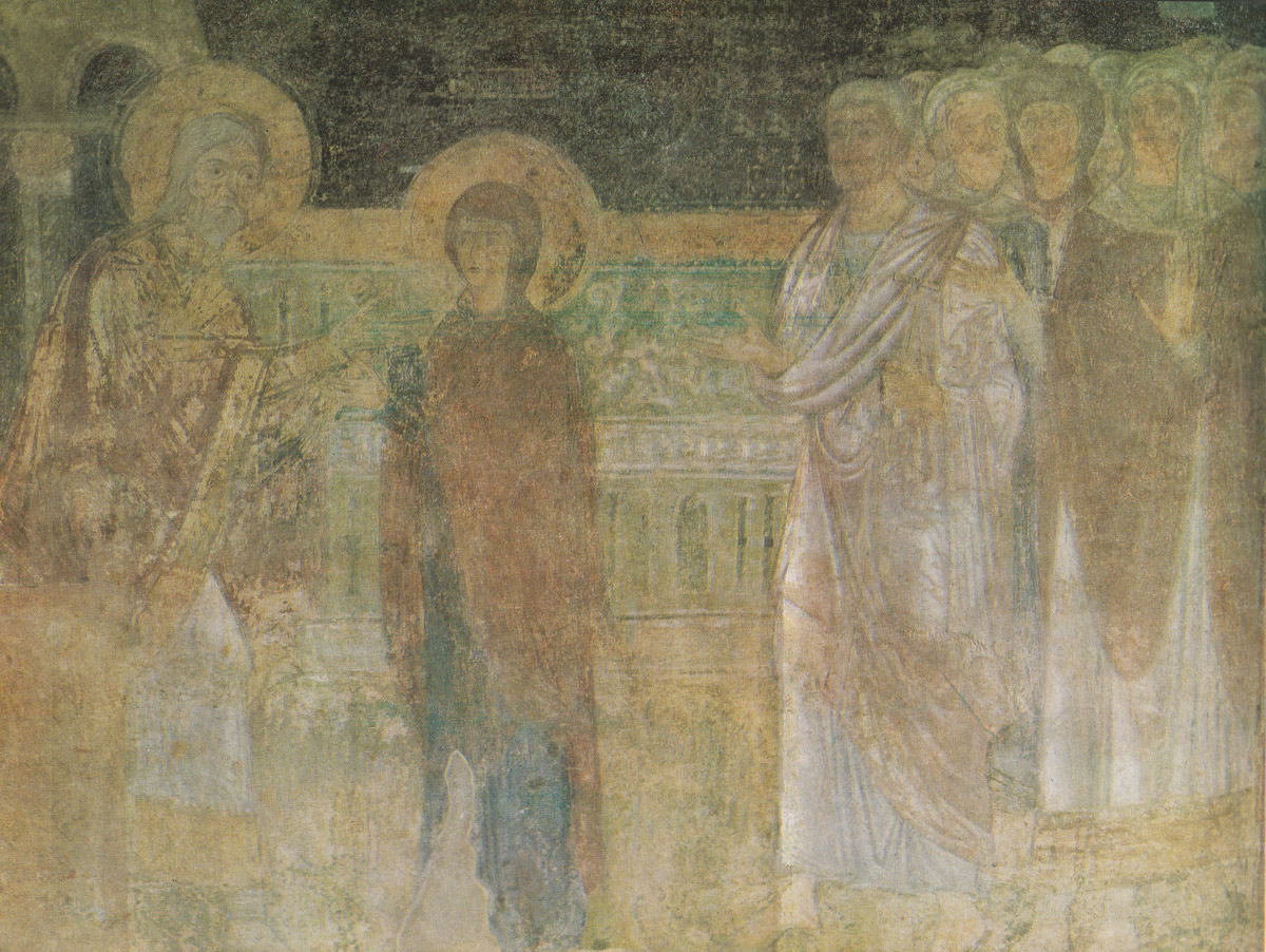 The other murals on the ground floor of St. Sophia are religious in content. The frescos in the Chapel of Joachim and Anna relate the story of the Virgin Mary and her parents; the frescos in the Chapel of SS. Peter and Paul tell of the Acts of the Apostle Peter. The frescos in the south apse called St. Michael's Chapel are devoted to the Archangel Michael, who was regarded as the patron saint of Kiev and of the Prince's armed retainers (druzhina). The chapel features a monumental half-figure of the Archangel Michael with figures of the Church Fathers below. The vault before the chapel apse bears a picture of Jacob Wrestling with the Archangel (on the north intrados) and The Outcasting of Satan (on the south intrados). The arch in the aisle before the chapel contains several compositions: The Manifestation of the Archangel Michael to Zachariah, and The Manifestation of the Archangel Michael to Balaam (north intrados); also The Manifestation of the Archangel Michael to Joshua (south intrados). There still survives a blocked-in window surround that dates to the 11th century in the south wall of the apse of St. Michael's Chapel. Beneath it is an 18th-century composition The Miracle of the Archangel Michael at Coniah. The Apostle Paul. Detail. St. Peter and St. Paul's Chapel: The Apostle Peter. Detail. St. Peter and St. Paul's Chapel: Scene from The Life of St. Peter. Boy's head. Detail. St. Peter and St. Paul's Chapel: The Warrior. Nave. South-west column below the cupola: The north chapel is dedicated to St. George, the patron saint of Prince Yaroslav the Wise (his Christian name was George). A half-figure of St. George is painted on the upper half of the arching apse, with the Church Fathers depicted below. On the vault before the apse one finds scenes from the Life of St. George. Only some details of these compositions survive, in particular from The Inquisition of St. George, The Torment of St. George in the Pit of Lime and others. On the north wall to the left of the passage leading to the former cloister, there survives a fresco depicting a man in rich dress with rarsed arms. It is thought to be part of a large composition Yaroslav the Wise Before St. George (not pre-ved), and that the image is that of Grand Prince Yaroslav. The drawings of the male heads attract one's attention in St. George's Chapel. They are situated on the left of the figure of St. George, and executed as graffito drawings on the plaster background. It was apparently done during the restoration work carried out in the 19th century. Anonymous saint. St. George's Chapel: Saint. St. George's Chapel. 11th-century fresco: St. Barbara. Detail. Nave. North-west cruciform column: The Prophet. 11th-century fresco. St. George's Chapel: St. Nicholas. 11th-century fresco. Nave: Saint. 11th-century fresco. Nave: Anonymous saint. St. George's Chapel: St. Nadiya. St. George's Chapel: Manifestation of the Archangel Michael to Balaam. Detail. St. Michael's Chapel: Anonymous saint South inner gallery: St. Thocus. South inner gallery: St. Philippolus. South outer gallery (western section): St. Eudoxya. West inner gallery: St. Theodore the Stratilate. Detail. North inner gallery: Anonymous saint. St. George's Chapel: An important place in the cathedral's fresco design is occupied by statue-like figures of sacred personages such as the holy martyrs, Church Fathers, apostles, canonized warriors, etc. And in the west section of the cathedral which was set aside for women during the services, such frescos usually represented "saintly wives" such as St. Barbara, St. Juliana, St. Christina, St. Catherine, etc. However, among the most vividly depicted women are the four figures set in medallions on the west side of St. George's Chapel. To our regret, most of the frescos have not retained their original bright colours. The backgrounds were blue and the prevailing colours - dark, red, ochre, white and olive green. The artists paid special attention to painting the face, thus creating a remarkable gallery of images having their own individual traits. One is particularly drawn to the portrayal of the Apostle Peter (Chapel of St. Peter and St. Paul), of St. Barbara (west arm of the transept, of St. Thocus (south inner gallery), St. Theodore (north inner gallery) and many others. The Baptism. Detail. Baptistry: The Forty Martyrs of Sebaste. Details. Baptistry: Both the mosaics and frescos in the cathedral are closely bound to the interior architecture. They harmonize with its forms from the ornamental aspect and through the language of their art and expressive depth of their images. Emperor Constantine. 11th-century fresco. St. Michael's Chapel: Emperor Justinian. 11th-century fresco. Joachim and Anna's Chapel: Mary Receiving the Purple and Cochineal. 11th-century fresco. Joachim and Anna's Chapel: Jacob Wrestling With the Archangel Michael. 11th-century fresco. St. Michael's Chapel: Figure of Prince (?). 11th-century fresco. St. George's Chapel: Fresco Archangel: