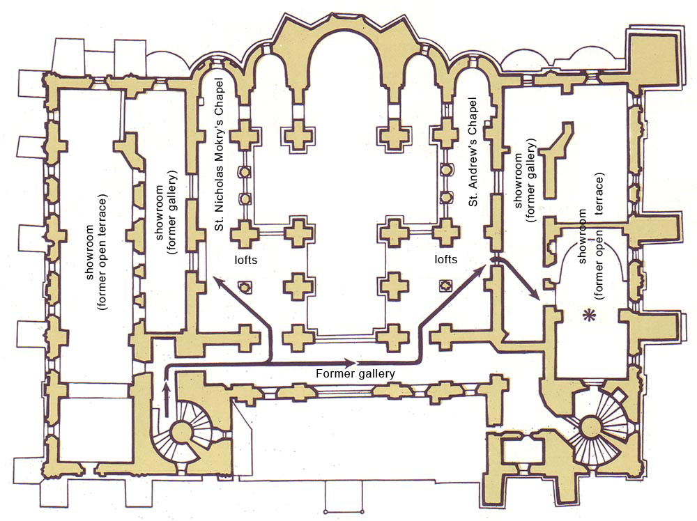 LOFTSUpon mounting the tower stairs to the first floor, the visitor reaches the lofts of St. Sophia Cathedral. The lighting and opulence here are in sharp contrast with the dimly lit upper landings on the tower staircases.The west section of the lofts was re-built in the 18th and 19th centuries. The north and south sections fully retain original medieval architectural form. They extend from west to east, and look out upon the cathedral proper through wide arcades. In olden times they contained chapels at the eastern ends. PLAN OF ST. SOPHIA CATHEDRAL, First floorKEY TO PLAN