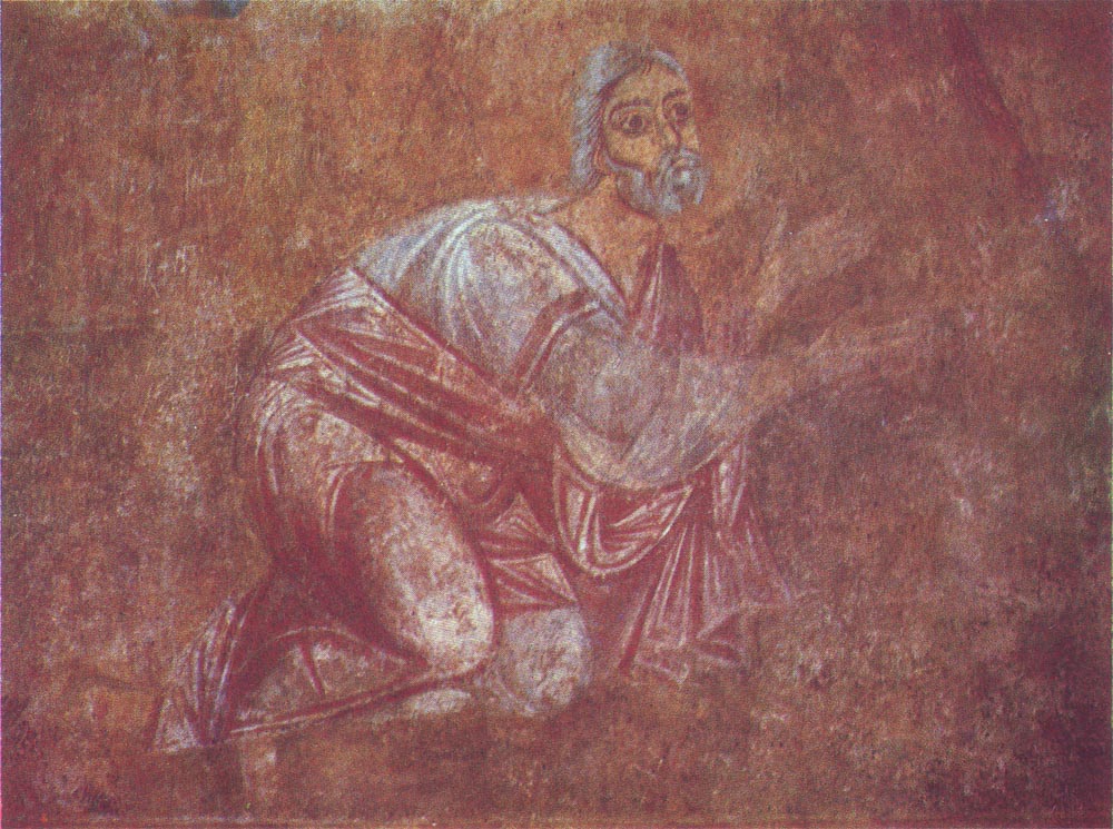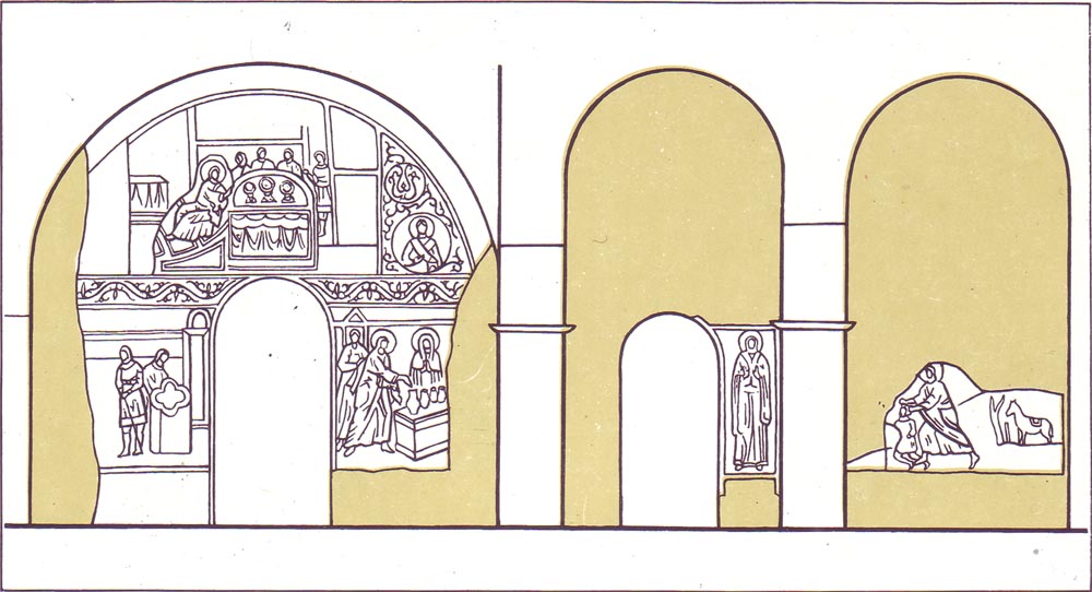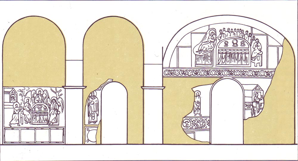 The west sections are spacious and well-lit chambers each having a central cluster column upon which rest the wall arches which support the four small cupolas. The grandeur and richness of the lofts are a dis-tinitive feature of St. Sophia Cathedral which indicate the direct influence of the tastes of the prince and his court on the cathedral's architecture. In the lofts survive an interesting series of fresco compositions subordinated to a single conception. As the prince and his family and their retinue received holy communion in the lofts at their own credence-tables, the subjects of the murals here are linked with the mystery of the Eucharist. Enterior. Lofts: Lofts. Erescos in the south-west cupola: Lofts. North wall. Diagram showing frescos arrangement: Lofts. South wall. Diagram showing frescos arrangement: In the north loft, opposite the triple arcade over the north arm of the transept, the frescos depict two evangelistic scenes: The Last S upper and beneath it The Miracle of the Loaves and Fishes (the lower scene is not fully preserved, fragments of the 19th-century oil paintings on both sides of the frescos do not correspond to the early murals in subjects). On the west wall, we find The Three Youths in the Fiery Furnace and, on its right, Abraham and the Angels (a prototype of the Trinity). In the south loft, opposite the triple arcade over the transept and on both sides of the door, is the fresco The Miracle in Cana (the miracle of turning water into wine). In the west part of the loft there are two frescos: Abraham Meets the Three Strangers and Abraham Offers Up Isaac. Abraham Meets the Three Strangers: Abraham Offers Up Isaac: Besides these large compositions, the lofts contain well-preserved fresco medallions with images of the archangels in the vaults of the cupolas. All the surfaces of the central cluster columns are decorated with rich ornamentation. In various places in the lofts there are also fragments of 18th-century oil paintings: "The Ancient of Days" on the arch in the north loft, and on the column the portrait of Bishop Vlasiy; at the south end of the west loft- Lot and His Daughters, The Last Judgement, The Deluge. In the west section there are 19th-century paintings on the wall and the vaults. "The Ancient of Days". Detail. Oil. 18th century: In the old days, there were exits from the lofts: onto the first-storey gallery over the inner cloister below, and from there onto an open terrace over the outer cloisters below. After the reconstruction carried out at the turn of the 18th century, the upper galleries and open terraces were replaced by new enclosed premises. At the present time, these are exhibition halls with exposed masonry that tells about the original architectural forms. Vaults of the first floor galleries have recently been discovered in the south hall. *** This visit to the exhibition halls off the lofts finishes our tour of the interior of St. Sophia Cathedral. The visitor may then pass on to the architectural memorials of the 18th century in the museum grounds. However, do not hurry to part with St. Sophia for good. Come again to visit its beautiful interior and to feast your eyes on the beauty of the architectural lines, the sweeping curves of the arcades and vaults. Go around all the outside of the building, feel the powerful ancient walls, look at the unique designs of the medieval masonry. You will find new treasure of beauty and form, new depths and facets of this beautiful creation built by the hands of Old Rus artisans. Remember that it became a model for many generations of Old Rus architects. Remember that Kiev's St. Sophia Cathedral represents one of the most brilliant pages in the history of Ukrainian and world culture. Read more: |