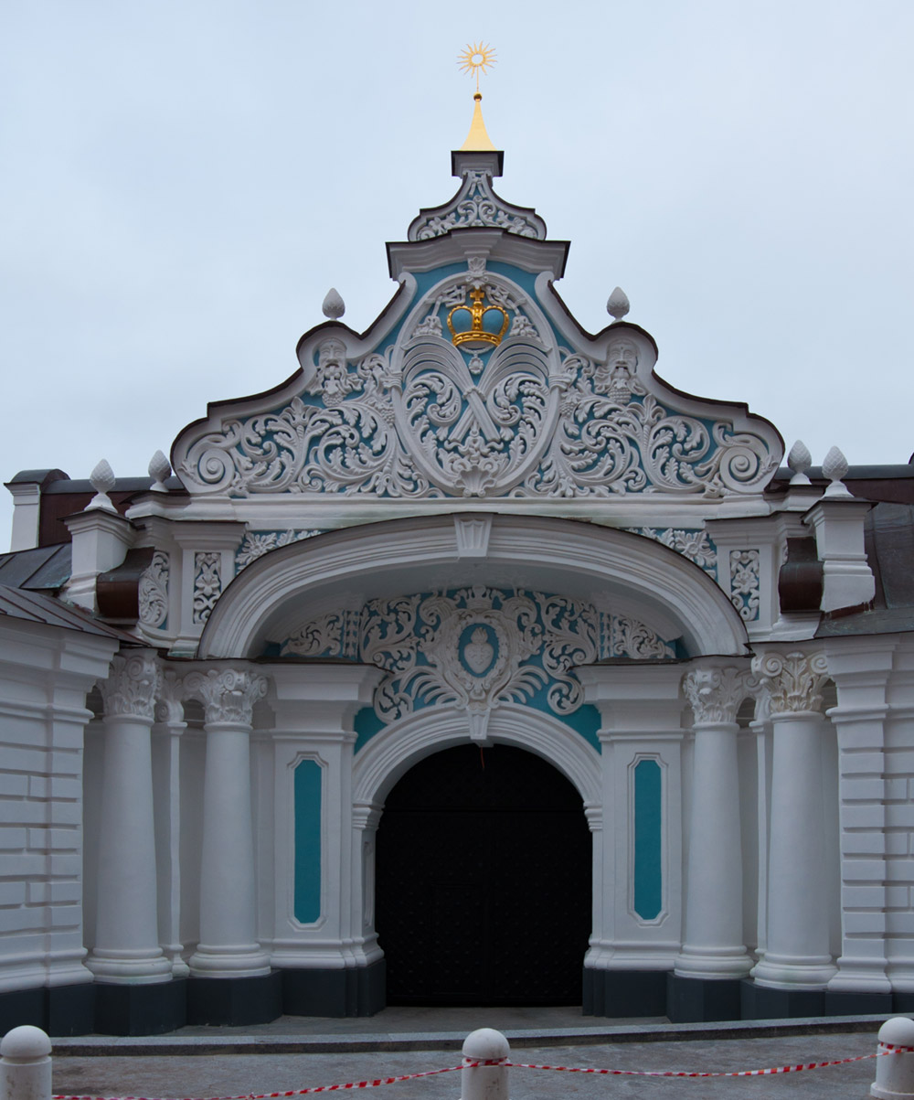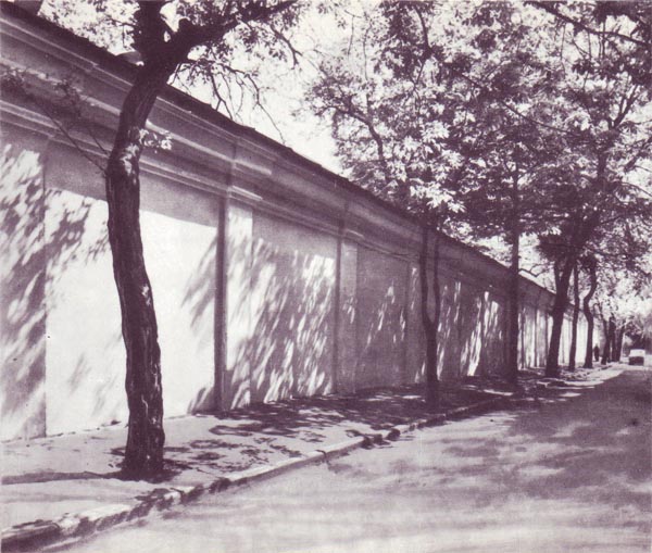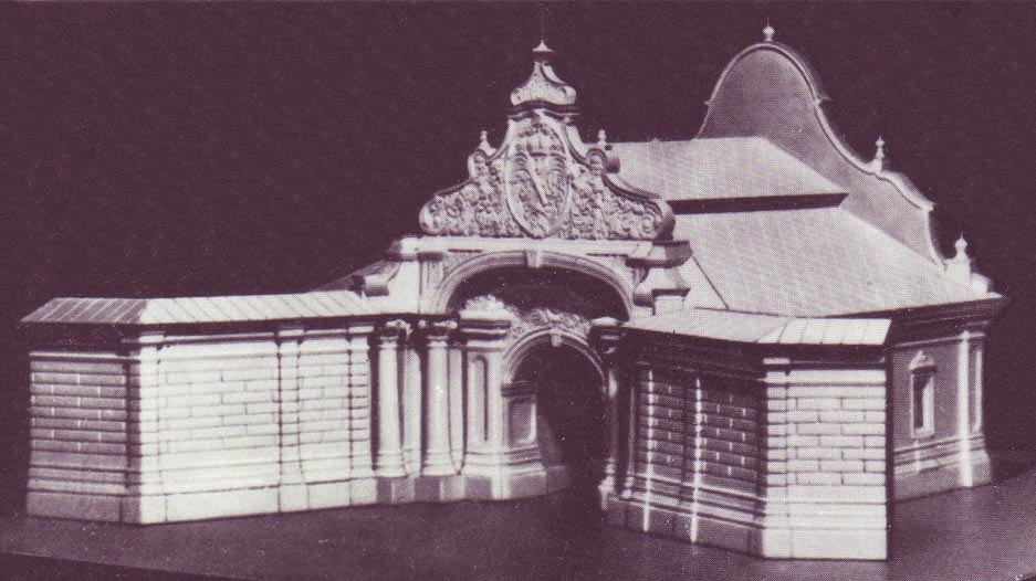 ZABOROVSKY GATE (WEST GATE) and the BRICK WALLTo view the Zaborovsky Gate you must go out through the south entrance tower on to Vladimir-skaya Street, turn to your right and pass round the corner to Streletsky Lane which runs along the west bounds of the museum grounds. On the east side of Streletsky Lane, you will find remains of the original brick wall of the monastery built in 1745-1746. A wall such as this enclosed all the monastery in the 18th century. But in the 19th, wherever the district was given over to building dwelling houses, the old wall on many sites was torn down and there arose new brick walls along Vladimirskaya Street and in Bogdan Khmelnitsky Square. So that today, only sections of the old 18th-century wall remain: these are on Streletsky Lane, Streletskaya Street and, in part, beside the Bell Tower in Bogdan Khmelnitsky Square. The 18th-century wall was made of bricks and laid with a lime mortar. It was about four metres high. The wall incorporated flat pilasters and was topped with a complex-shaped cornice. Along the bottom ran a two-stepped socle. Some distance along Streletsky Lane, you will find the Zaborovsky Gate (West Gate) - one of the most remarkable specimens of Ukrainian baroque. The gate was built in 1746 as the western main entrance to the metropolitan's courtyard. It was named after the Kiev Metropolitan Raphael Zabo-rovsky, who ordered it built. He was a highly educated man for his time: he was much attracted to the art of architecture and building; he both sketched and drew up plans himself. To carry out his wide building plans, he enlisted the services of J. Schadel who constructed a number of notable buildings in Kiev. The Zaborovsky Gate is one of the architect's finest creations. The memorial of the gate that exists today is only a part of the 18th-century gate which took the form of a one-storey rectangular building 16.5 m x 13.5 m. In the middle part, there was an arched entrance four metres wide with a guardhouse on each side. From the west and east sides above the entrance towered rich baroque pediments. In the 18th century, a street ran right from the Golden Gate to the Zaborovsky Gate. From this street you could see the whole complex of the St. Sophia Monastery, with the metropolitan's residence in the foreground. But as Kiev began to be built up in the 19th century, following the new city planning, the Zaborovsky Gate found itself isolated in a remote little lane, and the ground level before it had risen by one metre. Therefore, in the years 1822 and 1823, the gate was finally blocked up and the guardhouses dismantes. In place of the metropolitan's front courtyard, a garden was laid out. Today, the front portal and the pediment are the only surviving parts of the original structure. West gate (Zaborovsky Gate|. Reconstruction by N. Kresalny: On either side of the gateway stand a massive pilaster and a pair of columns topped with Corinthian capitals. Over them is a beautiful ¦ baroque pediment. The placement of the columns and pilasters in different planes makes the whole structure particularly picturesque, and helps it blend harmoniously with the trapeziform area before the Gate. The inset design on the pilasters and the rounded columns set in niches produce a rich chiaroscuro effect. The beautiful outlines of the gate are enhanced by rich stucco ornamentation which covers the whole of the pediment and the arch. The stucco mouldings speak of the fact that folk craftsmen took part in the work. In the centre of the pediment is a big medallion depicting crossed torches. The Zaborovsky family crest- a flaming heart encircled with palm leaves - can be seen over the arch. The general composition of the gate, the coordination of architectural forms and all architectural elements speak of the fine artistic taste and high mastery of the creators of this little masterpiece. The Zaborovsky Gate is one of the most valuable gems in the treasury of ukrainian architecture. West Gate (Zaborovsky Gate). Western view: Pediment: Zaborovsky Gate before restoration work done in the 2011: Monastery wall. 18th century: |