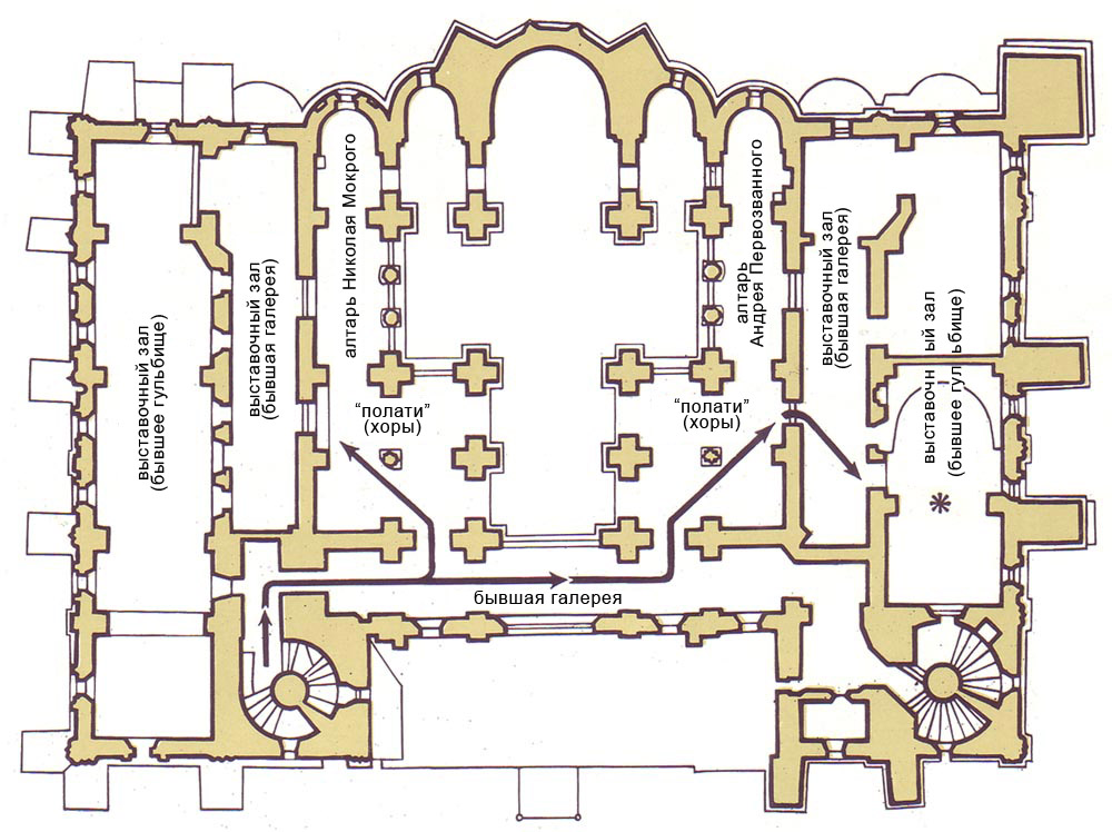 ХОРЫ Софийского собораПоднявшись по винтовой лестнице башен на второй этаж, посетитель попадает на хоры Софийского собора. Освещенность и великолепие хоров резко контрастируют с низкими затемненными помещениями на верхних лестничных площадках башен Софии Киевской. ПЛАН СОФИЙСКОГО СОБОРА, 2-й этажВторой этаж