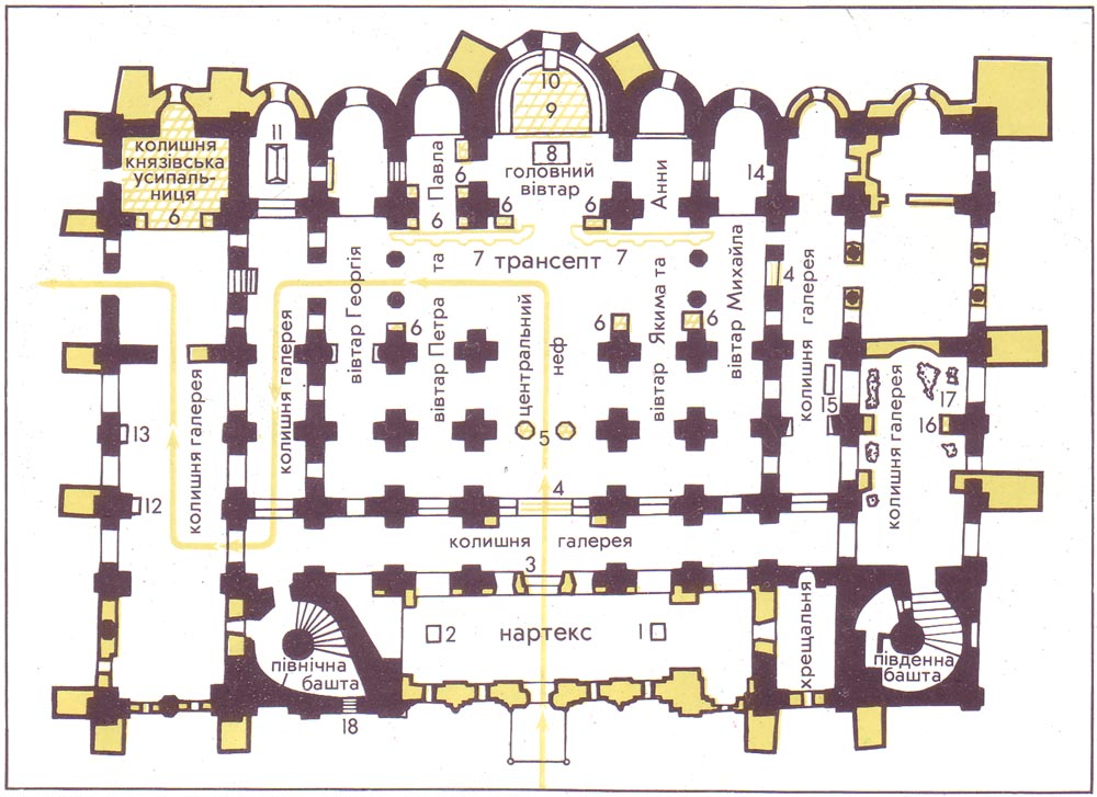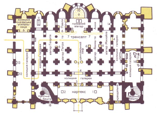 АРХІТЕКТУРА і РОЗПИСИ інтер'єру СОФІЇВСЬКОГО СОБОРУУвійшовши з нартекса (притвору) в СОБОР, відвідувач знайомиться з внутрішньою архітектурою, яка збереглася з XI століття без особливих змін. Враження від першого знайомства з інтер'єром храму прекрасно передав відомий радянський історик академік Б.Д.Греков: "Переступивши поріг Софії, ви відразу опиняєтесь у владі її грандіозності й пишності. Величні розміри внутрішнього простору, строгі пропорції, розкішні мозаїки і фрески полонять вас своєю досконалістю раніше, ніж ви встигнете вдивитися і вдуматися в усі деталі й збагнути все те, що хотіли сказати творці цього найбільшого твору архітектури і живопису". ПЛАН СОФІЇВСЬКОГО СОБОРУ, 1-й поверхПерший поверх УМОВНІ ПОЗНАЧЕННЯ